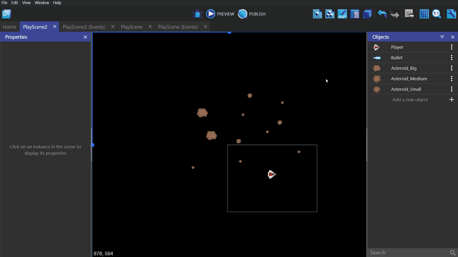 From this panel, create an object group called "Everything", and add your Player object, Bullet, and each type of asteroid to this group.